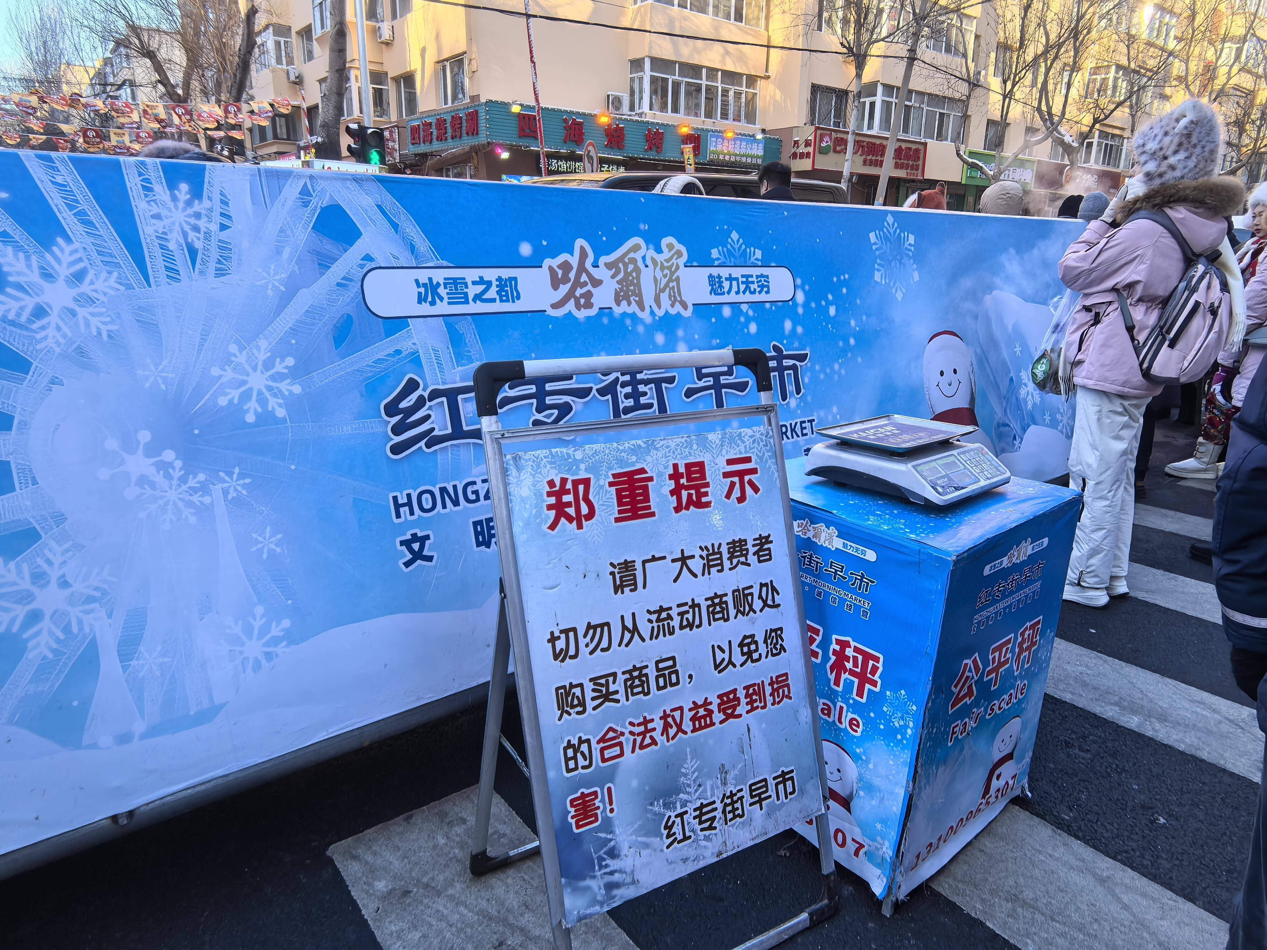 为了杜绝缺斤短两,让旅客安心消费,冰城一些早市正在入口、出口处设置了公允秤,配有专人,便利旅客随时复称。“正在红专街早市买了三斤冻梨,复称后一点不差,的商家太实正在了!”来自武汉的旅客王先生对劲地说。
