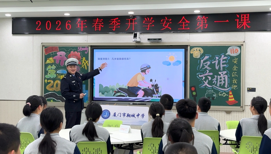 人平易近网厦门2月27日电 (余乃鎏)“反诈守好荷包子,交通护航人生,祝全体学生学业有成,金榜落款……”2月26日是新年春季开学首日,当天厦门市2026年春季开学平安第一课正在翔城中学开讲,讲堂最初,两名讲课同声寄语,迸发出雷鸣般的掌声。本次勾当由厦门市、市教育局结合从办,旨正在以交通平安和反诈宣讲“进讲堂”的体例,持续建牢全市中小学生开学平安防地。开课期间,通过视频曲播笼盖全市各校110余万名师生。